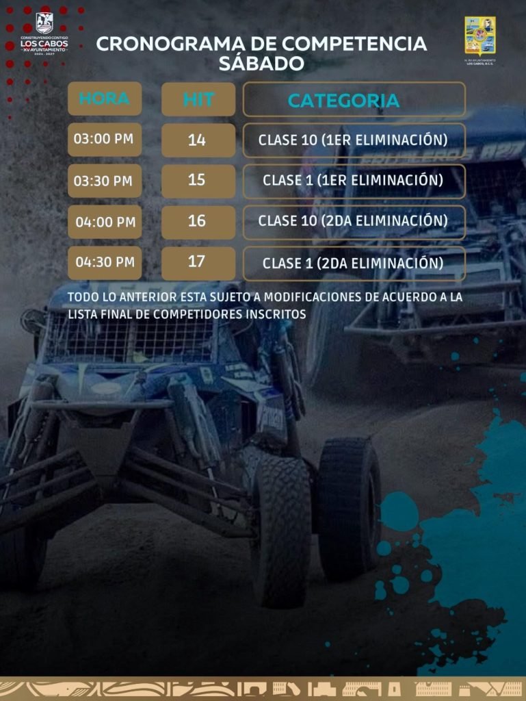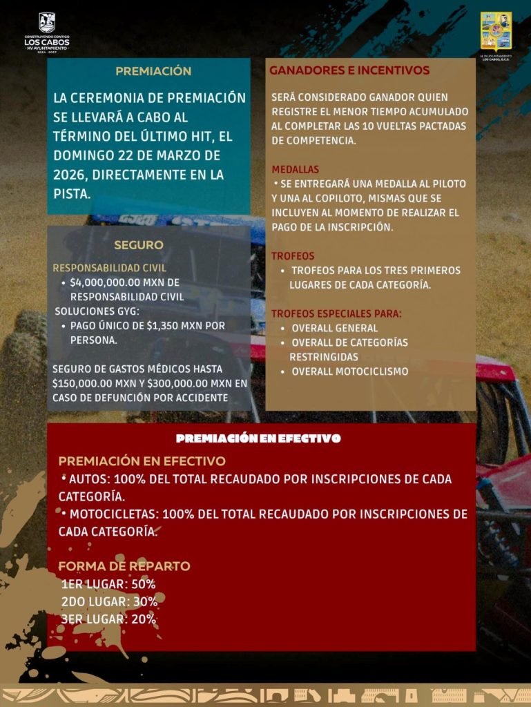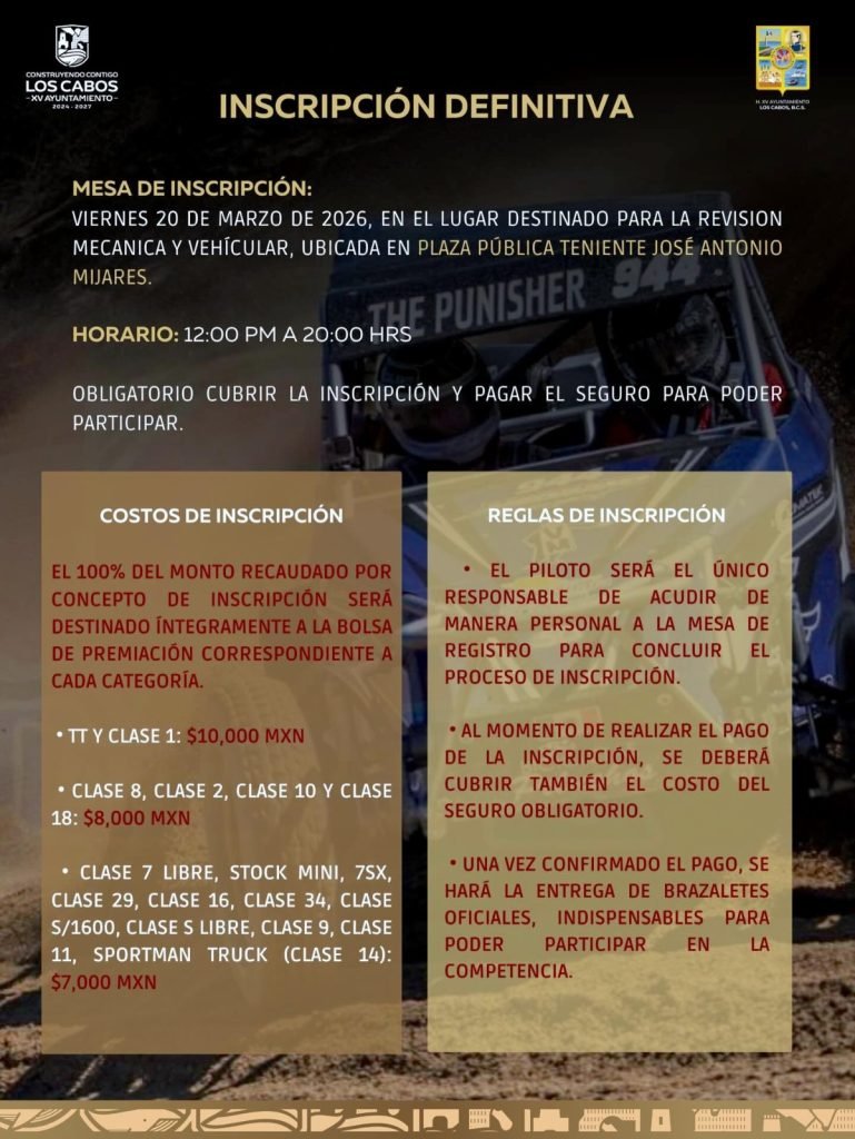 Como dato relevante, por primera vez la contingencia y revisión mecánica se realizará en la plaza pública Antonio Mijares, en el Centro Histórico de San José del Cabo, donde los vehículos ingresarán apagados, en un formato similar al de eventos internacionales como SCORE. Esta dinámica busca reforzar los estándares de seguridad, generar derrama económica directa en el primer cuadro de la ciudad y fortalecer la convivencia familiar en torno al deporte motor.