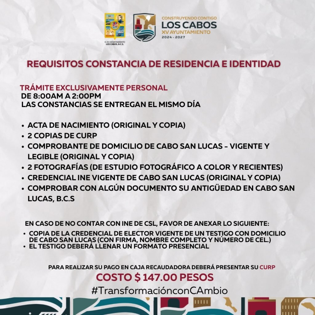 • La recepción de documentos es de lunes a viernes de 08:00 de la manaña a 02:00 de la tarde • El documento se entrega el mismo día Los Cabos, Baja California Sur.– Con el propósito de facilitar a la ciudadanía el acceso a documentación oficial, se informa que el trámite de Carta de Residencia […]