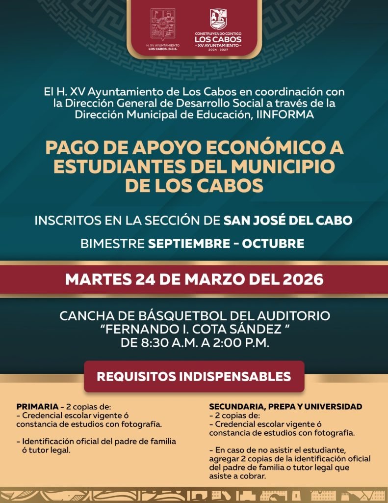 Correspondiente al bimestre septiembre-octubre Los Cabos, Baja California Sur.– El XV Ayuntamiento de Los Cabos, en coordinación con la Dirección General de Desarrollo Social y la Dirección Municipal de Educación, informa a la comunidad estudiantil sobre la próxima entrega del pago de apoyo económico correspondiente al bimestre septiembre–octubre, que se llevará a cabo de manera […]