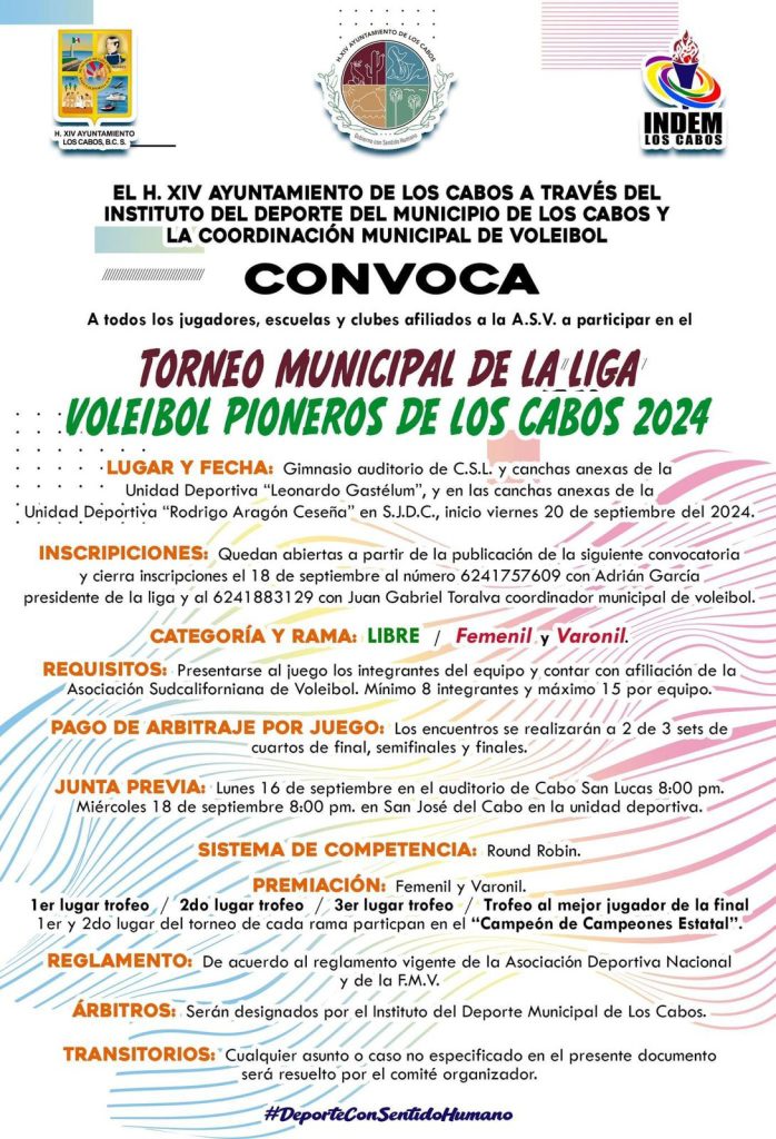 Los Cabos, B.C.S., 17 septiembre 2024.- El H. XIV Ayuntamiento de Los Cabos a través del Instituto del Deporte del Municipio de Los Cabos (INDEM) y la Coordinación Municipal de Voleibol, hace una atenta invitación a todas y todos los jugadores, escuelas y clubes afiliados a la Asociación Sudcaliforniana de Voleibol (A.S.V.) a participar en […]