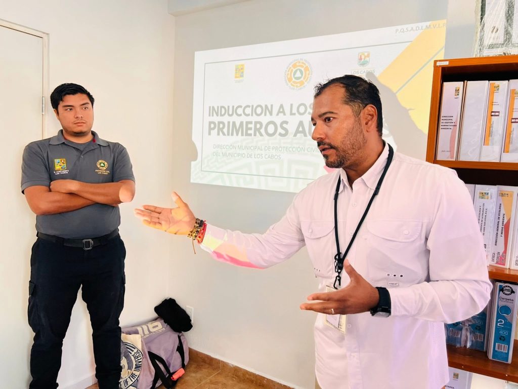 Los Cabos, Baja California Sur.- Con el propósito de fortalecer la respuesta ante situaciones de riesgo durante actividades operativas, a través de la Dirección Municipal de Protección Civil llevó a cabo una capacitación en primeros auxilios dirigida a quienes integran la Dirección Municipal de Gestión y Normatividad Ambiental de la XV Administración.
