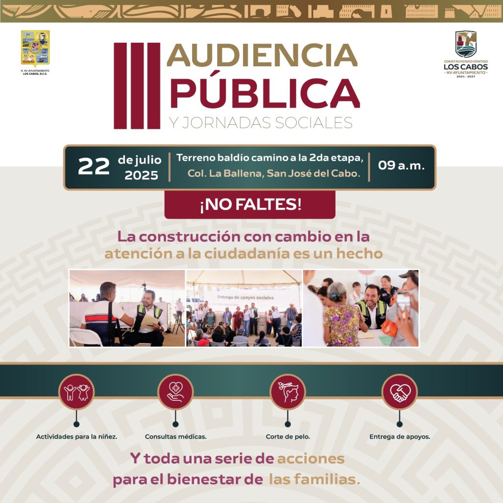 Los Cabos, Baja California Sur.– Con la participación de direcciones que conforma el XV Ayuntamiento de Los Cabos, el presidente municipal Christian Agúndez recorrió casa por casa para invitar personalmente a la población para asistir a la Audiencia Pública y Jornadas Sociales que se llevará a cabo este martes 22 de julio de 2025, a partir de las 09:00 horas, en un terreno ubicado sobre el camino a la segunda etapa de la colonia La Ballena, en San José del Cabo.