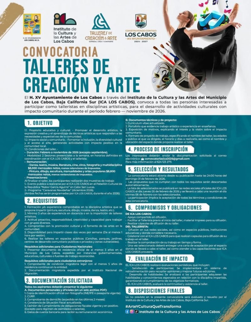 • La exposición pictórica de la artista plástica Cecilia Rodríguez, permanecerá abierta al público de manera gratuita hasta el 13 de febrero de 2026 Los Cabos, Baja California Sur.– El XV Ayuntamiento de Los Cabos, a través del Instituto de la Cultura y las Artes de Los Cabos (ICA), en coordinación con la Casa de […]