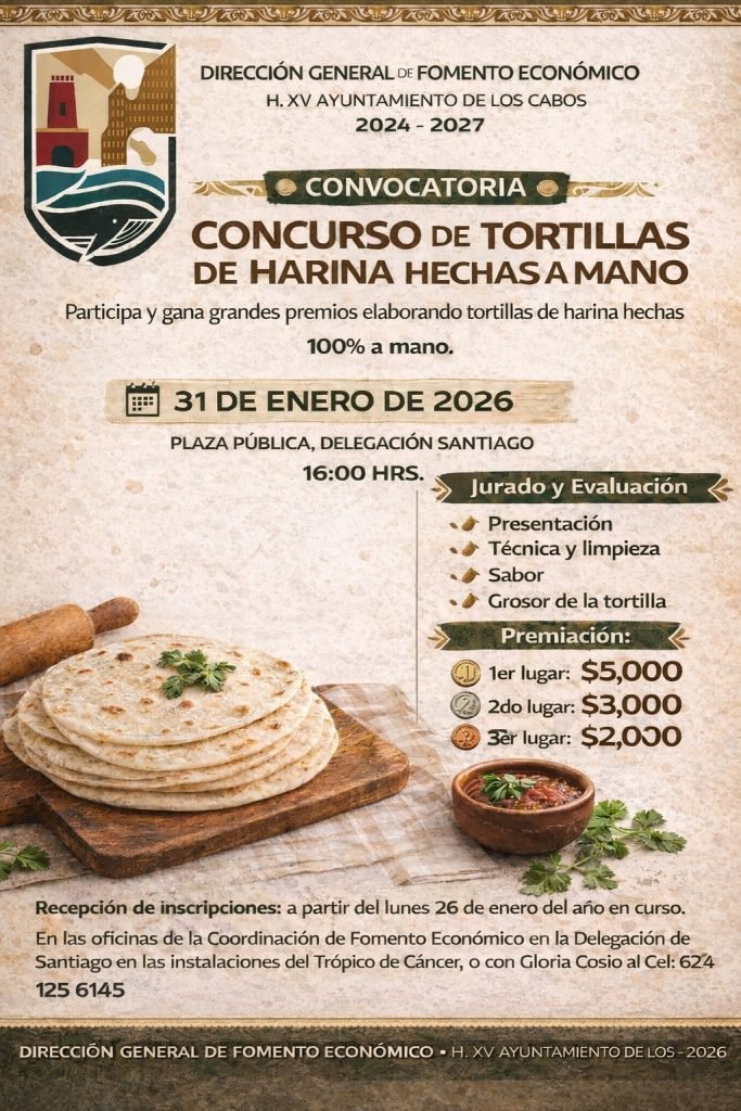 Los Cabos, Baja California Sur.– Con el objetivo de preservar las tradiciones gastronómicas de la región, impulsar el emprendimiento local y fortalecer la identidad cultural de las comunidades rurales, la Dirección General de Fomento Económico del XV Ayuntamiento de Los Cabos, convoca a la ciudadanía a participar en el Concurso de Elaboración de Tortillas de Harina Hechas a Mano.