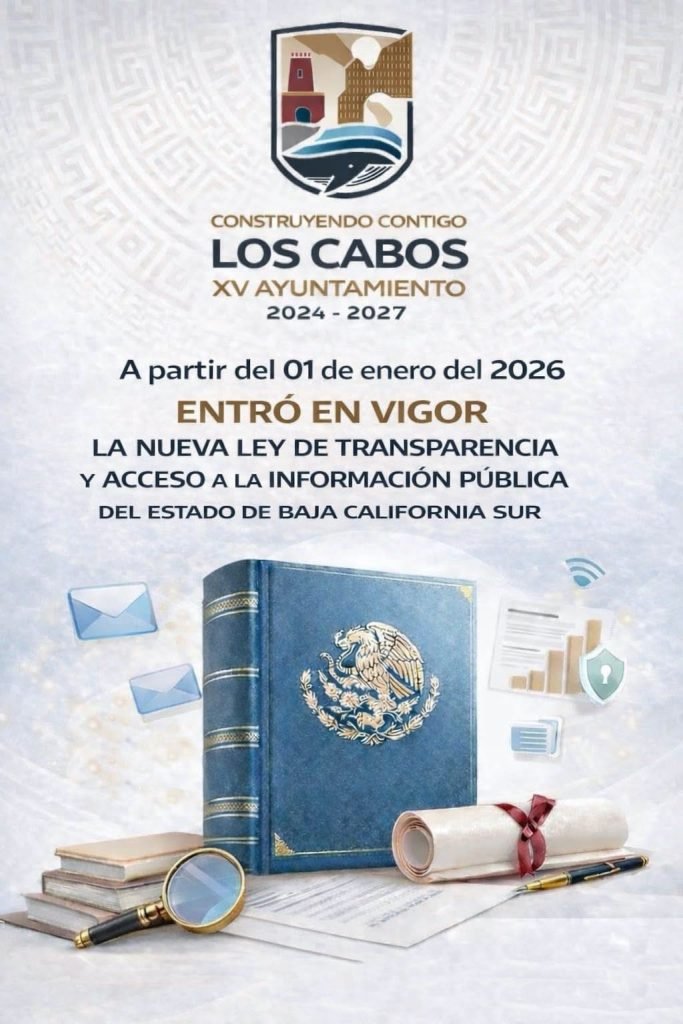 Los Cabos, Baja California Sur.- La directora municipal de Transparencia del XV Ayuntamiento de Los Cabos, Enedina Guadalupe Ceseña Castro informó que a partir del 01 de enero de 2026, entró en vigor la nueva Ley de Transparencia y Acceso a la Información Pública del Estado de Baja California Sur, la cual representa un avance significativo en el fortalecimiento del derecho de la ciudadanía a acceder a la información pública, así como en los procesos de rendición de cuentas y participación ciudadana.