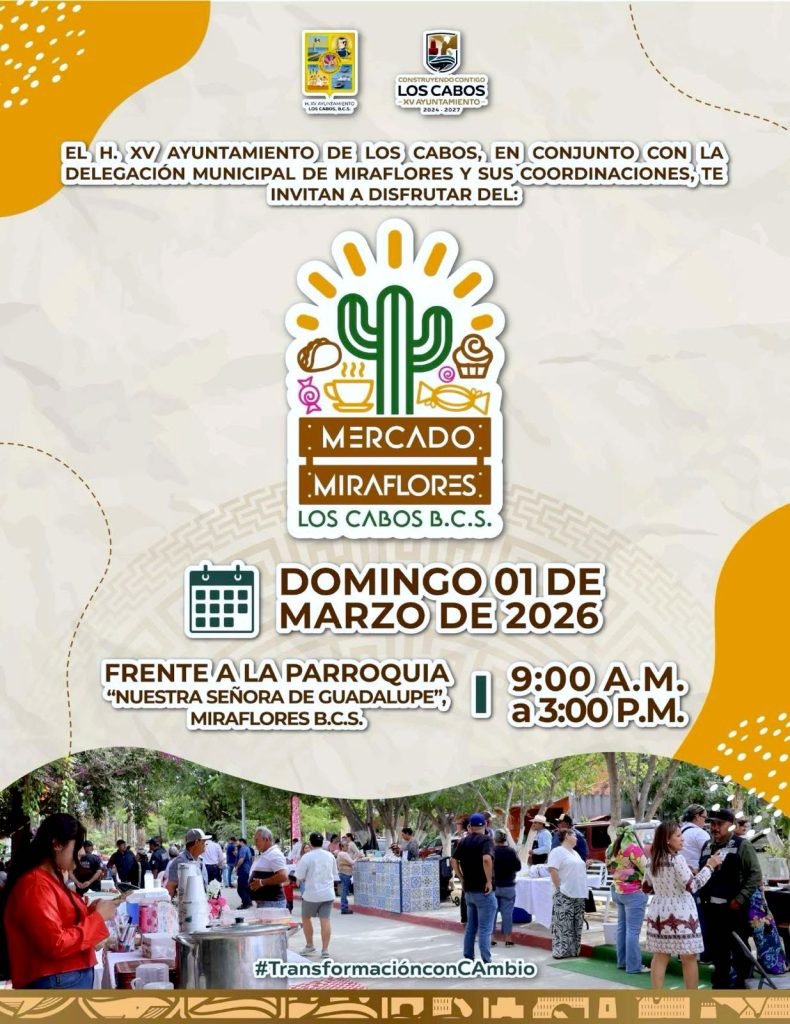 Los Cabos, Baja California Sur.– Con el objetivo de promover el talento local, fomentar el consumo responsable y fortalecer la economía comunitaria en las zonas rurales del municipio, el XV Ayuntamiento de Los Cabos invita a las familias cabeñas y visitantes para asistir al tradicional “Mercado Miraflores”, un espacio destinado al sano esparcimiento y al apoyo directo a productores y emprendedores de la región.
