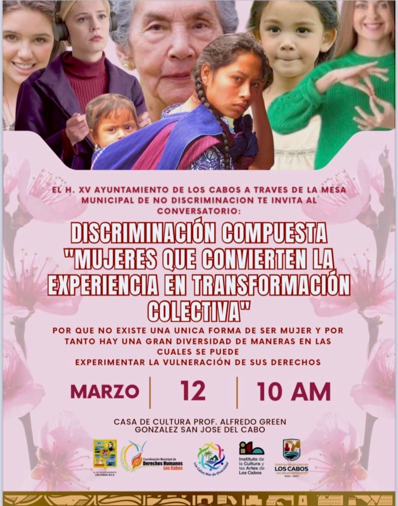 Los Cabos, Baja California Sur.– Con el propósito de promover la reflexión y fortalecer las acciones para prevenir y erradicar la discriminación, el XV Ayuntamiento de Los Cabos, a través de la Mesa Municipal de No Discriminación, realizará el conversatorio “Discriminación Compuesta: Mujeres que Convierten la Experiencia en Transformación Colectiva”.