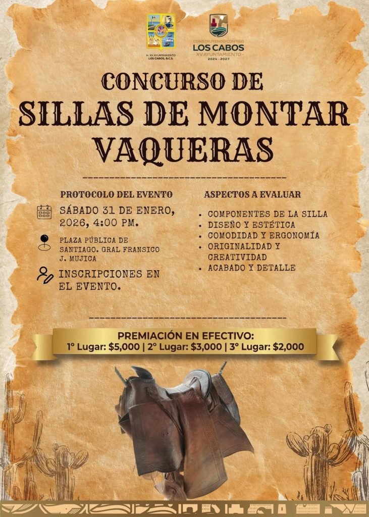 Los Cabos, Baja California Sur.– Con el fin de preservar y fortalecer las tradiciones del municipio, el XV Ayuntamiento de Los Cabos, a través de la Dirección Municipal de Desarrollo Rural invita a la ciudadanía a participar en el Concurso de Sillas de Montar Vaqueras, que se realizará en el marco del Primer Festival “Memorias del Ranchero Sudcaliforniano”.