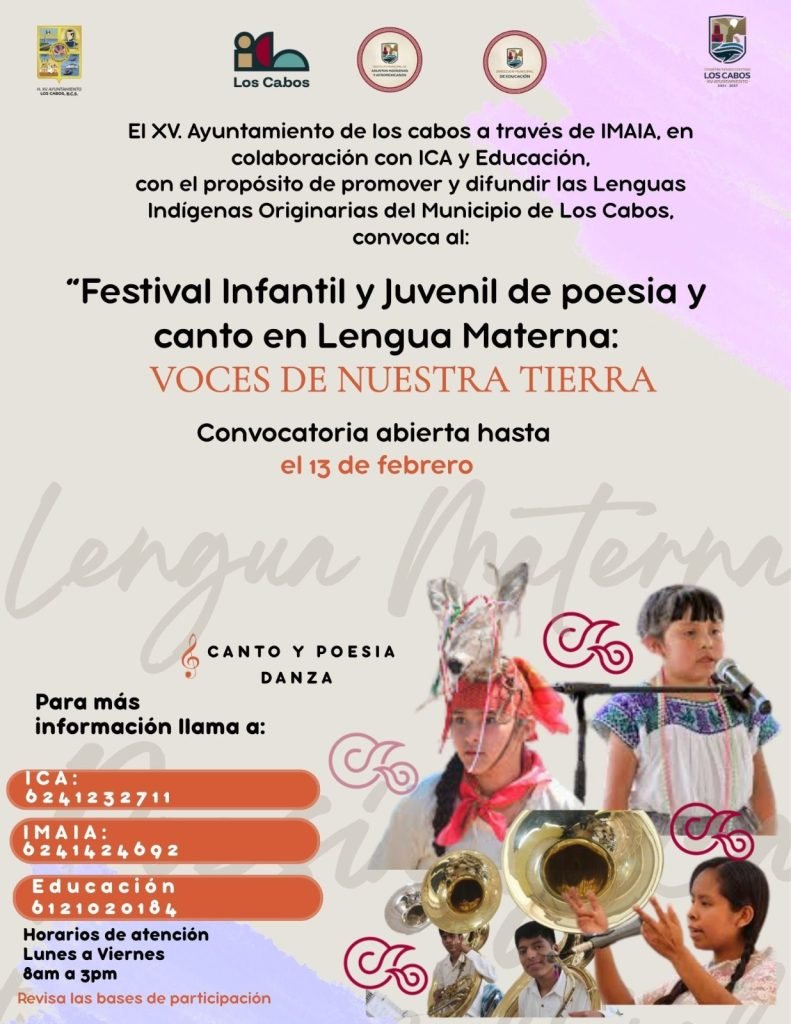 Los Cabos, Baja California Sur.– Con el objetivo de promover, preservar y difundir las lenguas indígenas originarias, el XV Ayuntamiento de Los Cabos emitió la convocatoria para participar en el Festival Infantil y Juvenil de Poesía y Canto en Lengua Materna “Voces de Nuestra Tierra”.