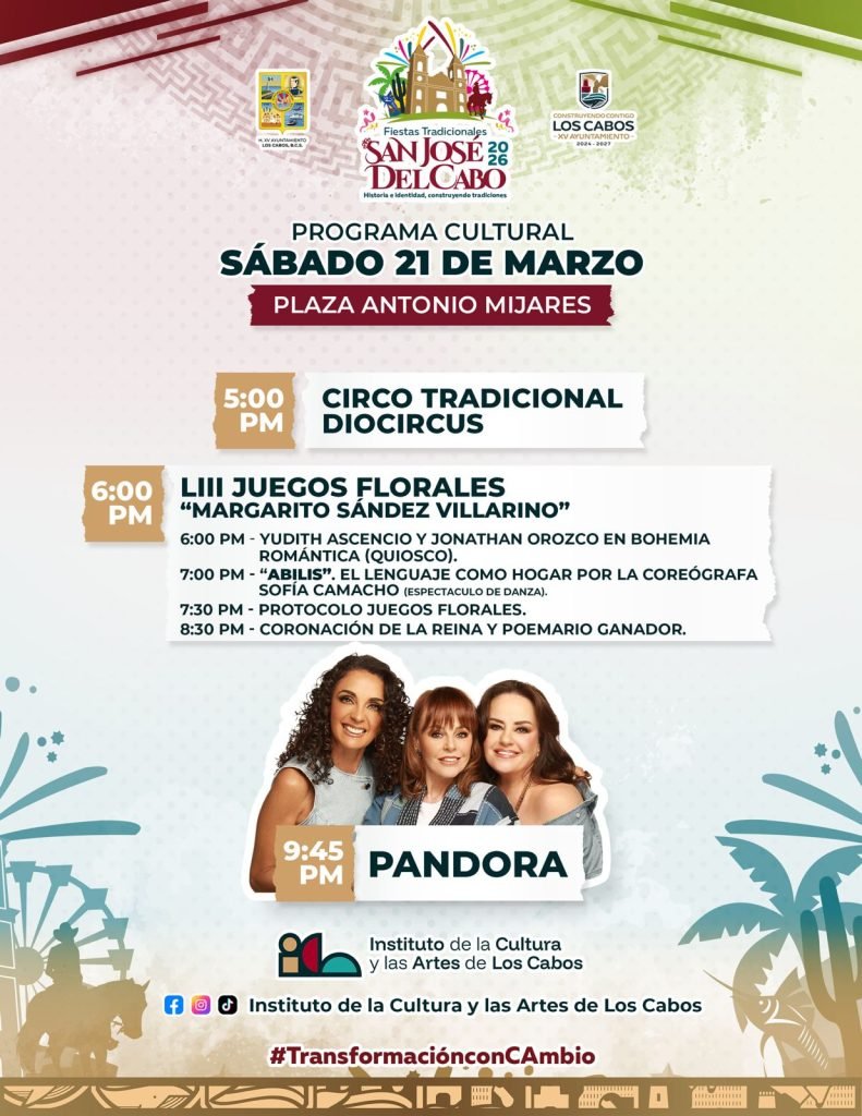 Los Cabos, Baja California Sur.– La plaza pública Antonio Mijares será sede de una parte importante de la agenda artística y cultural de las Fiestas Tradicionales San José del Cabo 2026, con actividades programadas del 18 al 22 de marzo, entre las que destaca la presentación del grupo musical Pandora.